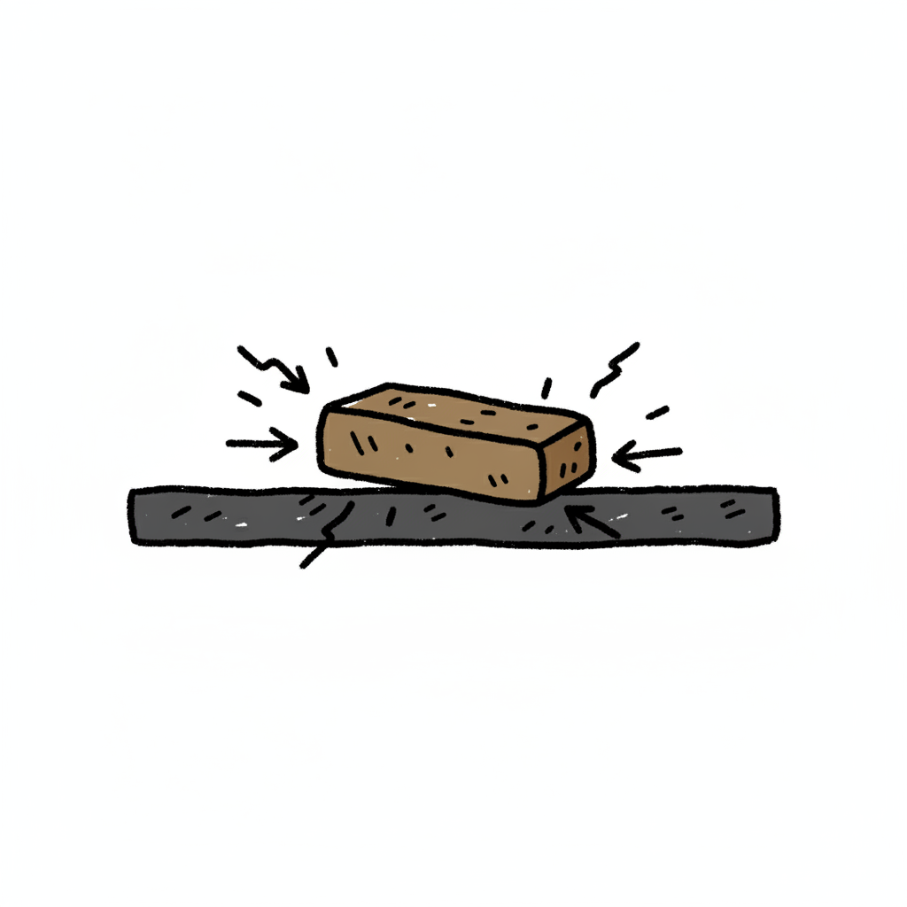 Ein Ziegelstein drückt auf eine Oberfläche, die sich biegt und Risse bekommt.