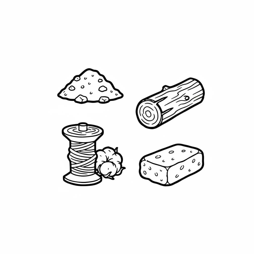 Schwarz-Weiß-Illustrationen von Erde, Holzstamm, Baumwollfaden und Ziegelstein.