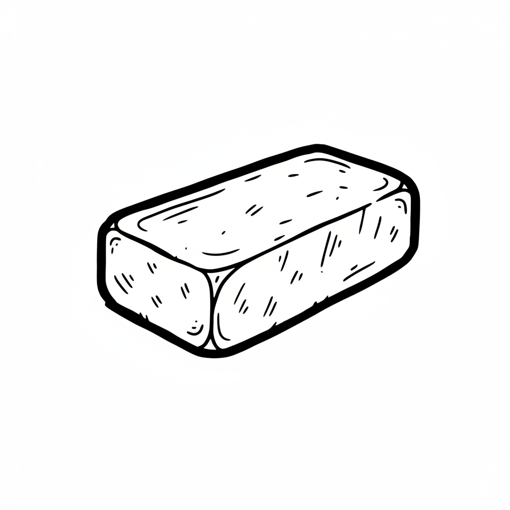 Schwarz-weiße Skizze eines rechteckigen Blocks mit abgerundeten Kanten, isoliert auf Weiß.