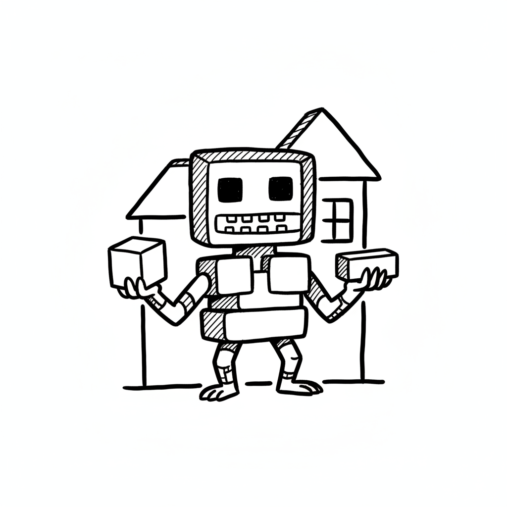 Ein blockiger Roboter hält einen Würfel und einen Ziegelstein vor einem Hausumriss.
