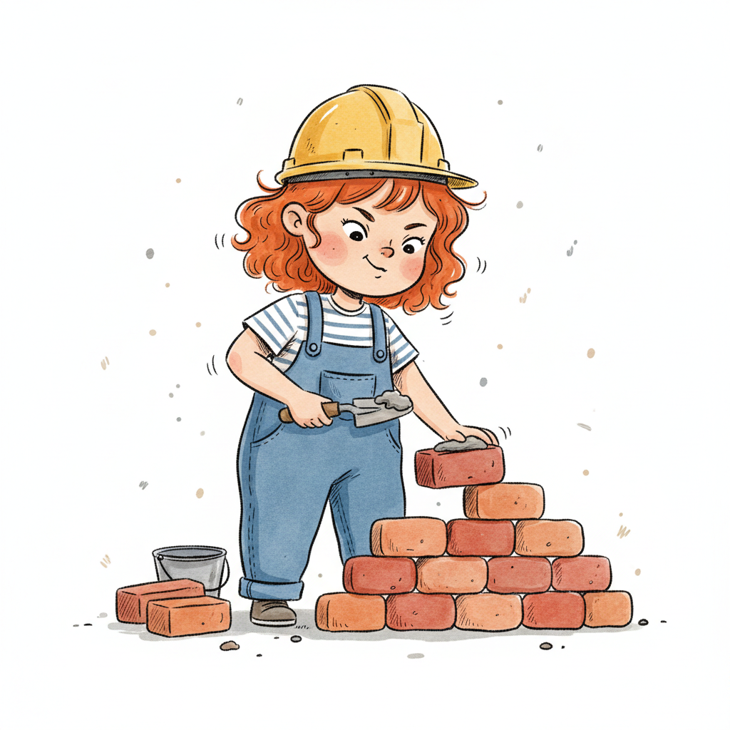 Niedliches Mädchen mit Bauhelm und Latzhose mauert mit Ziegelsteinen und einer Kelle.