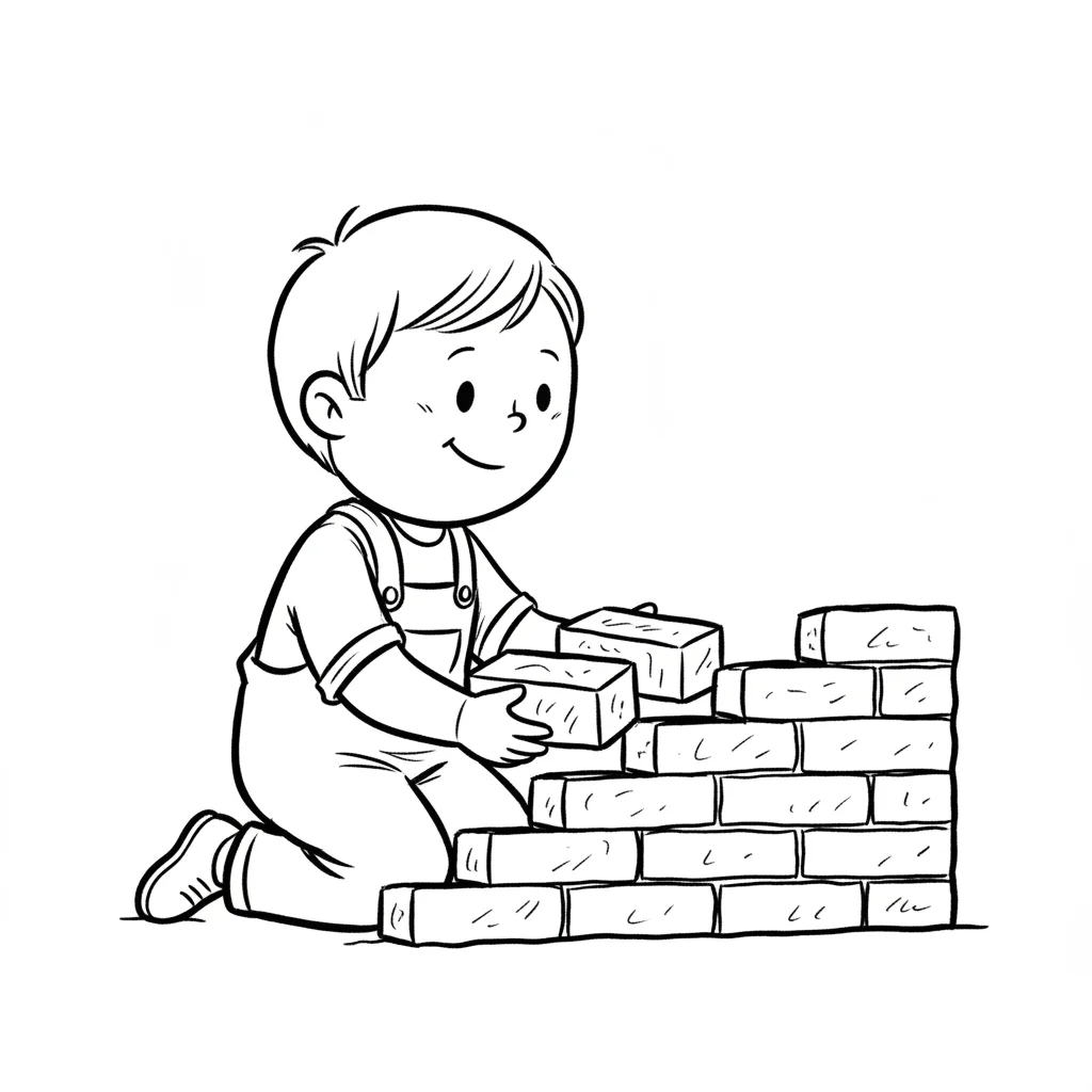 Ein lächelnder Cartoon-Junge kniet und baut eine Mauer aus Ziegelsteinen. Malvorlage.