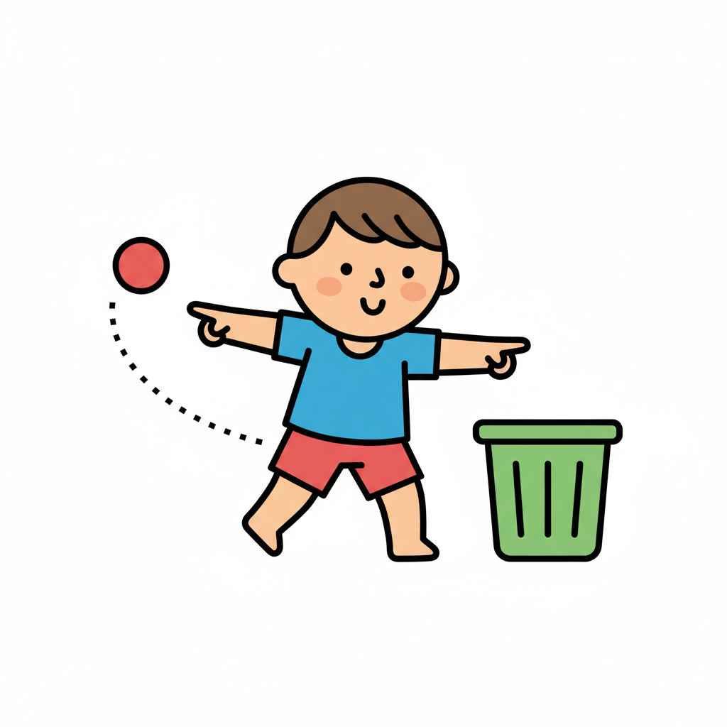 Ein Junge spielt mit einem Ball und zielt auf einen Mülleimer.