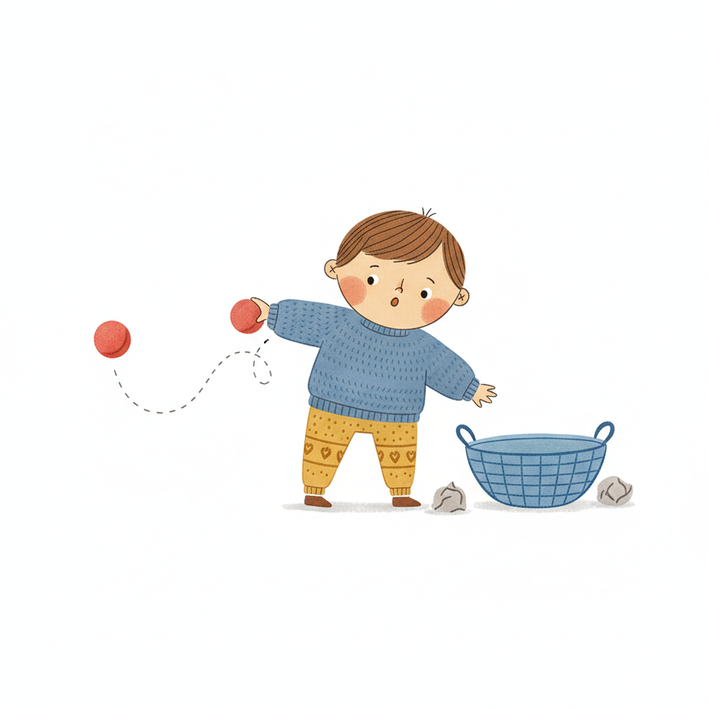 Ein Junge spielt mit roten Bällen und zielt auf einen Korb.