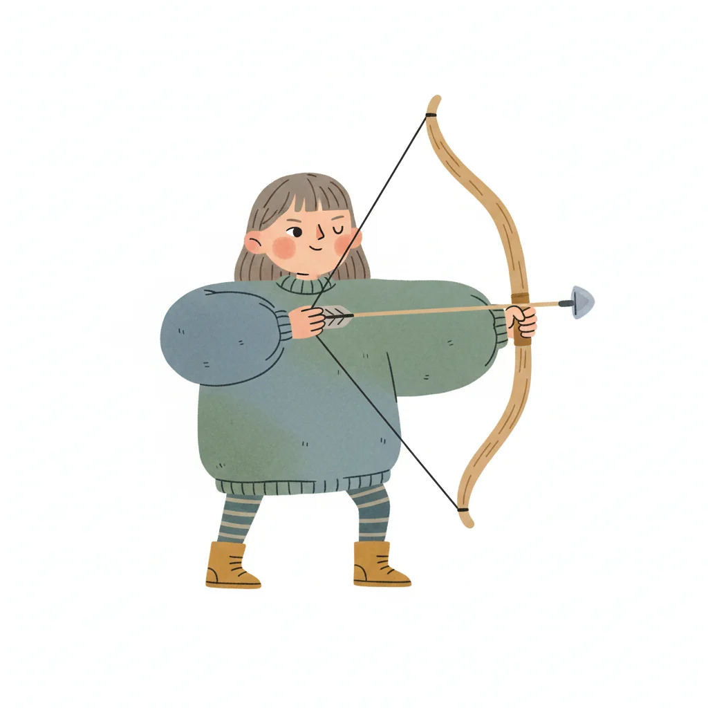 Ein Kind mit einem großen Pullover zielt mit einem Bogen.