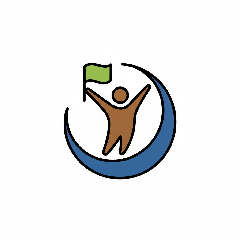 Stilisierte Figur hält grüne Flagge, umrahmt von blauem Halbkreis, symbolisiert Erfolg/Zielerreichung.