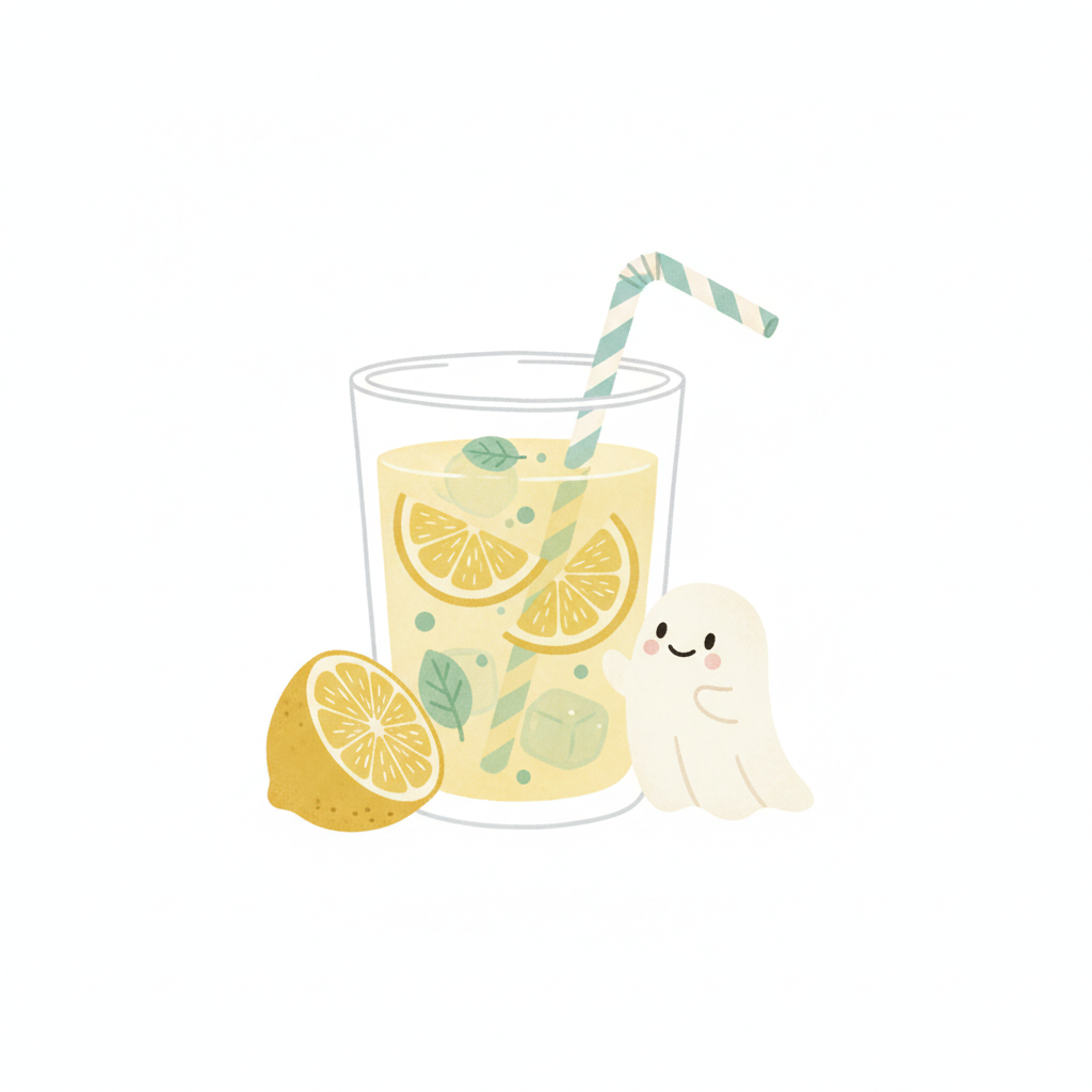 Ein Glas mit Zitronenlimonade und einem süßen Geist neben einer Zitrone.