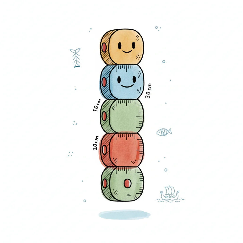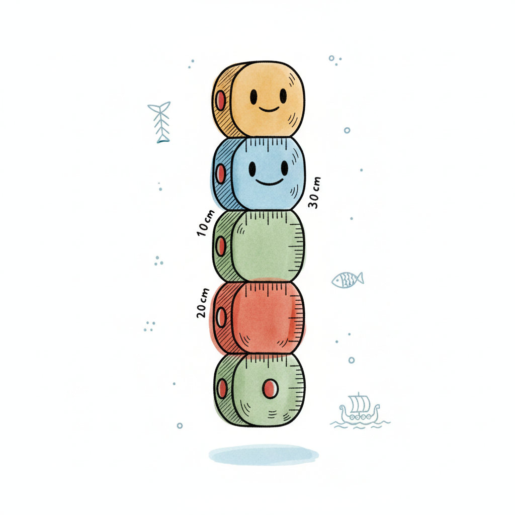 Fünf bunte, lächelnde Messband-Würfel stapeln sich, umgeben von maritimen Symbolen.