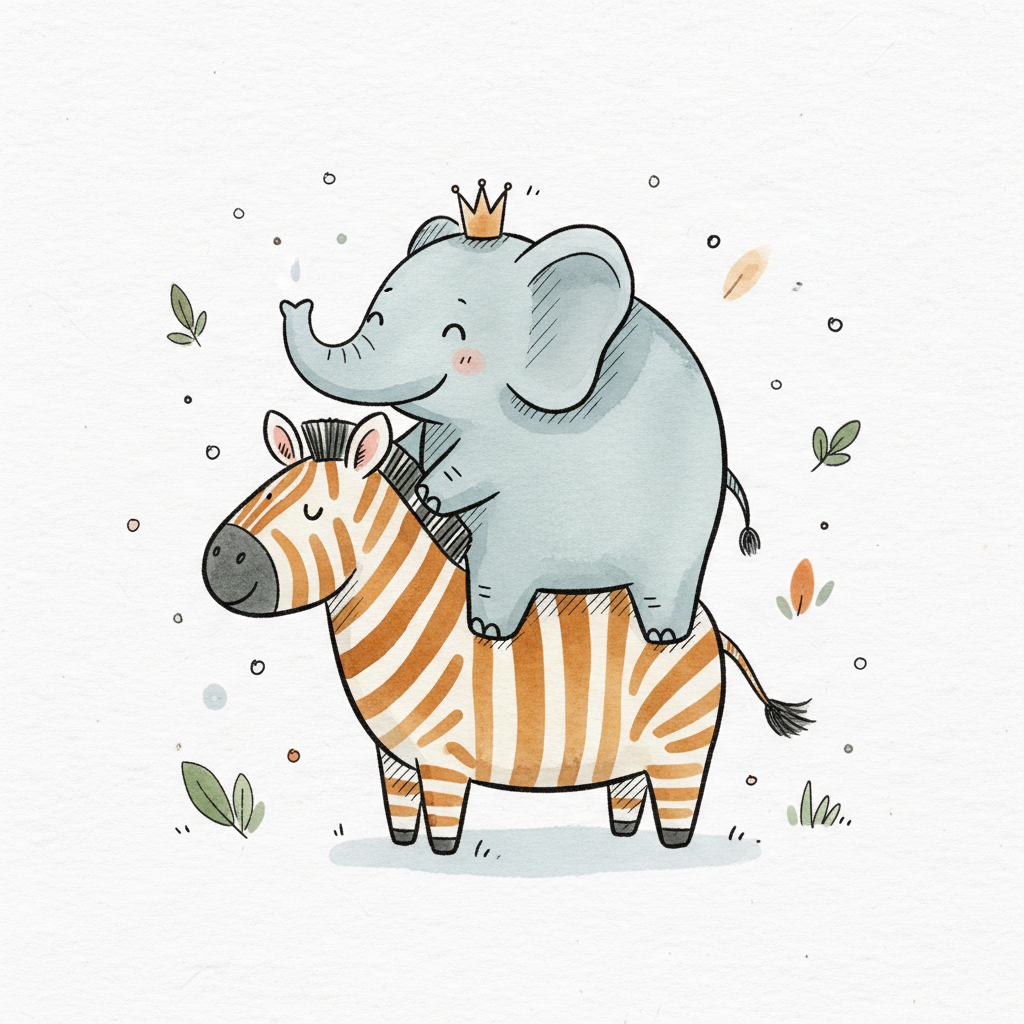 Niedlicher Elefant mit Krone reitet auf einem Zebra in einer fröhlichen, kindlichen Illustration.