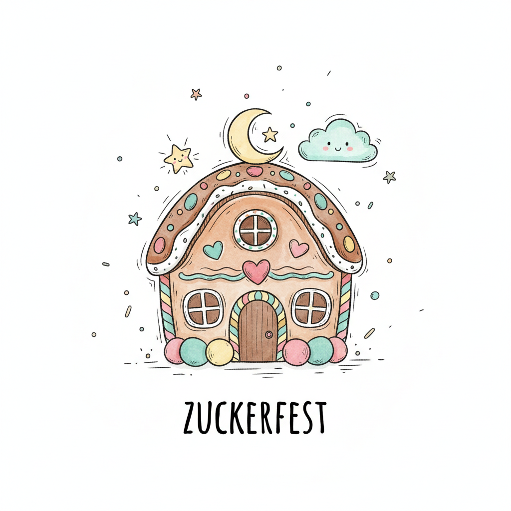 Süßes Lebkuchenhaus mit Mond, Sternen und Wolke, darunter der Schriftzug 'ZUCKERFEST'.