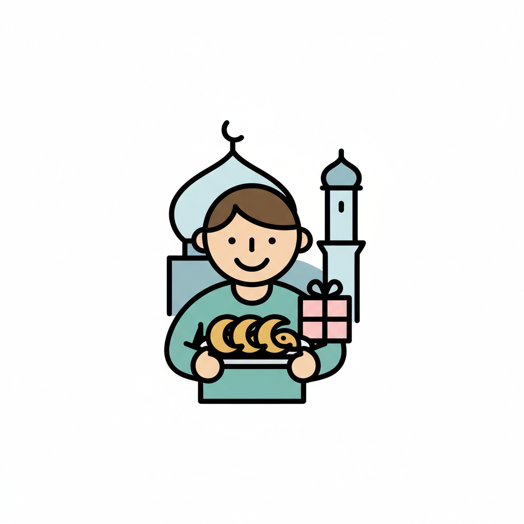Lächelnder Junge mit Gebäck und Geschenk vor Moschee, feiert Ramadan oder Eid.