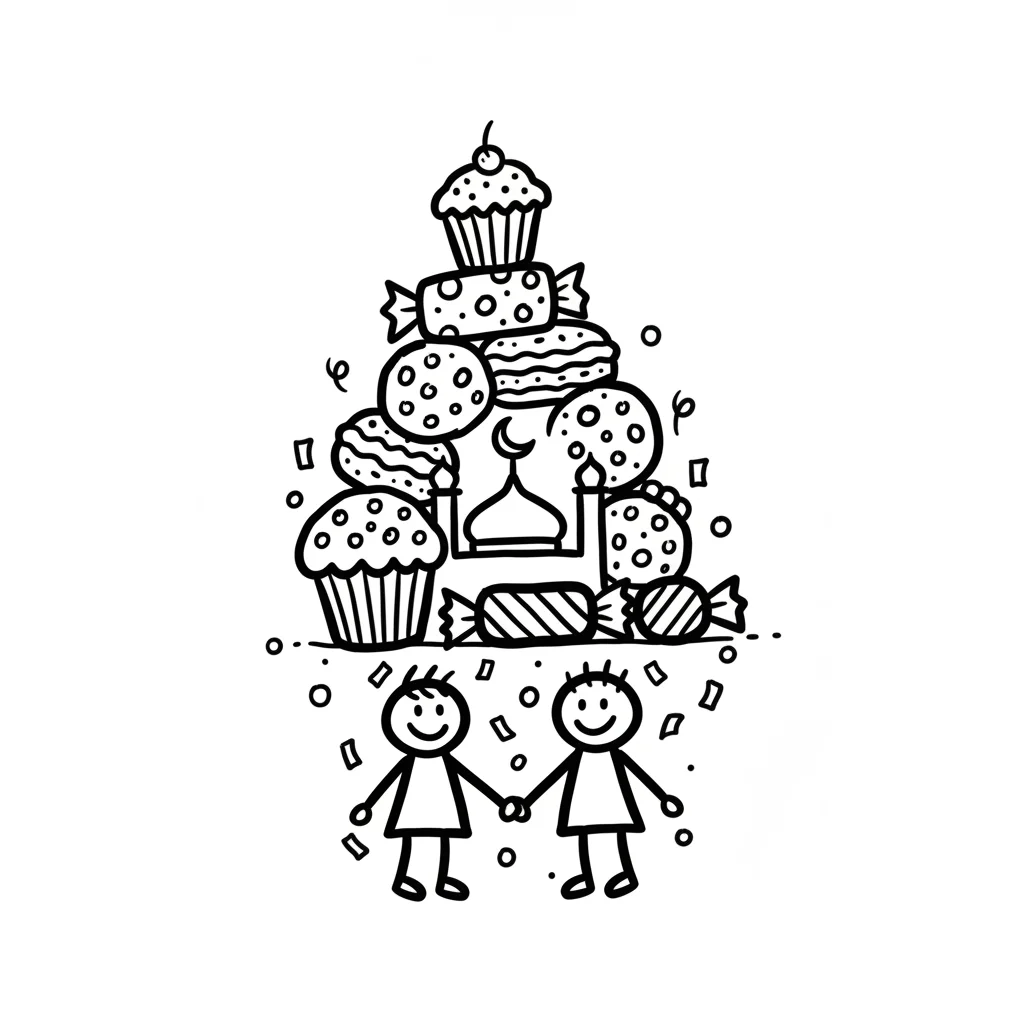 Schwarz-weiße Zeichnung von Kindern, die Händchen halten, unter einem Berg Süßigkeiten und einer Moschee.