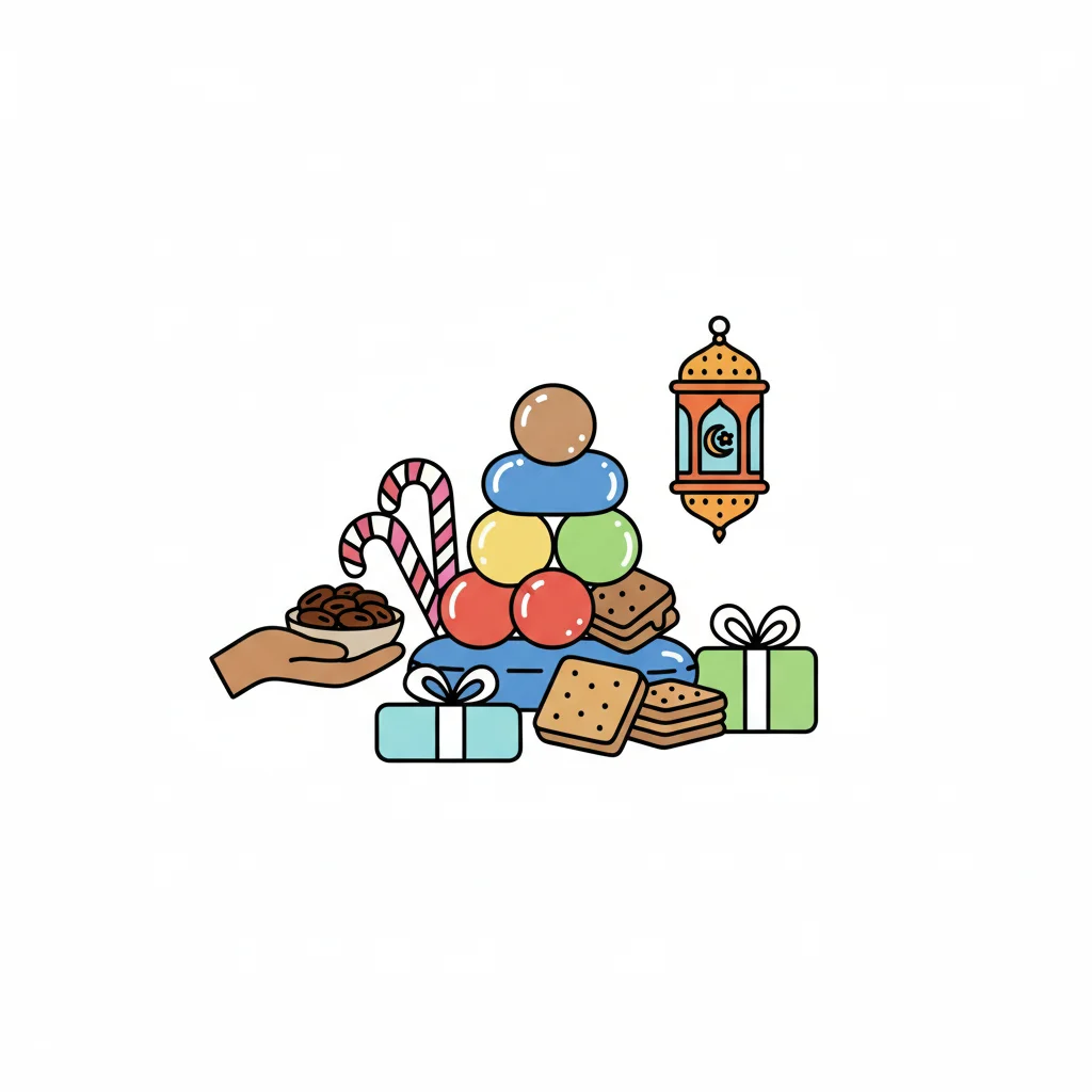 Festliche Eid-Szene mit Datteln, Süßigkeiten, Geschenken und einer traditionellen Laterne.