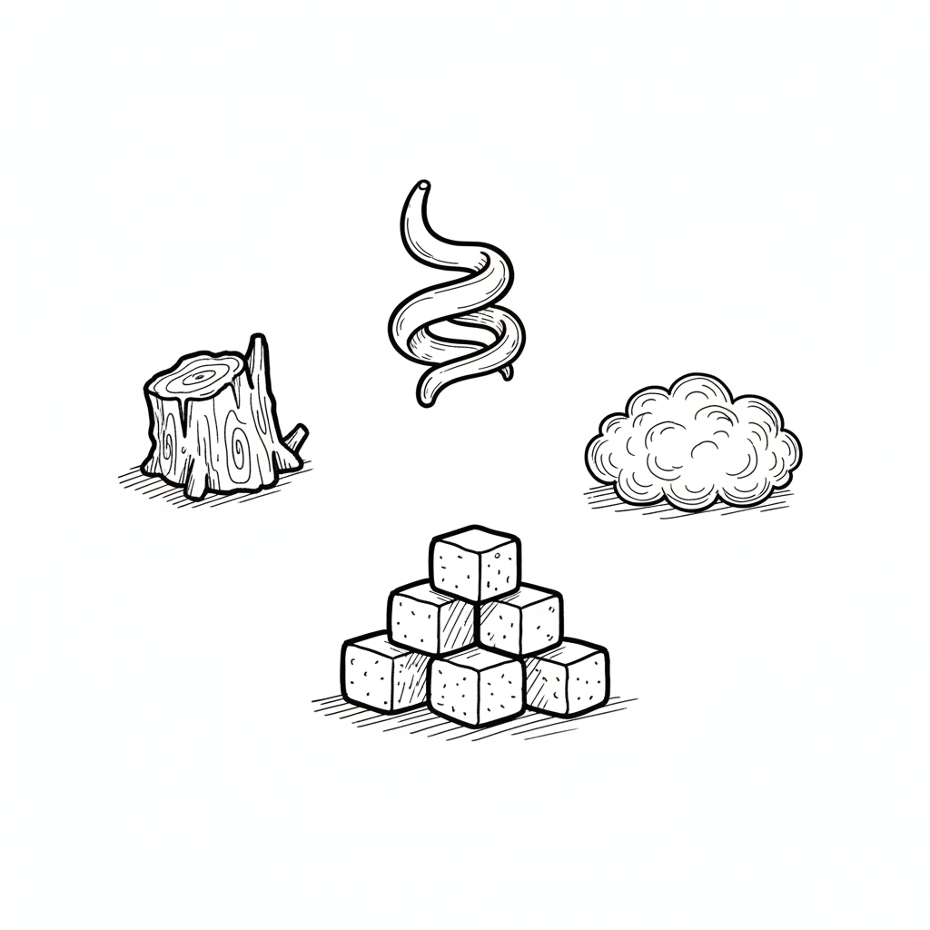 Schwarz-weiße Skizzen von Baumstumpf, Spirale, Wolke und Zuckerwürfeln auf weißem Grund.