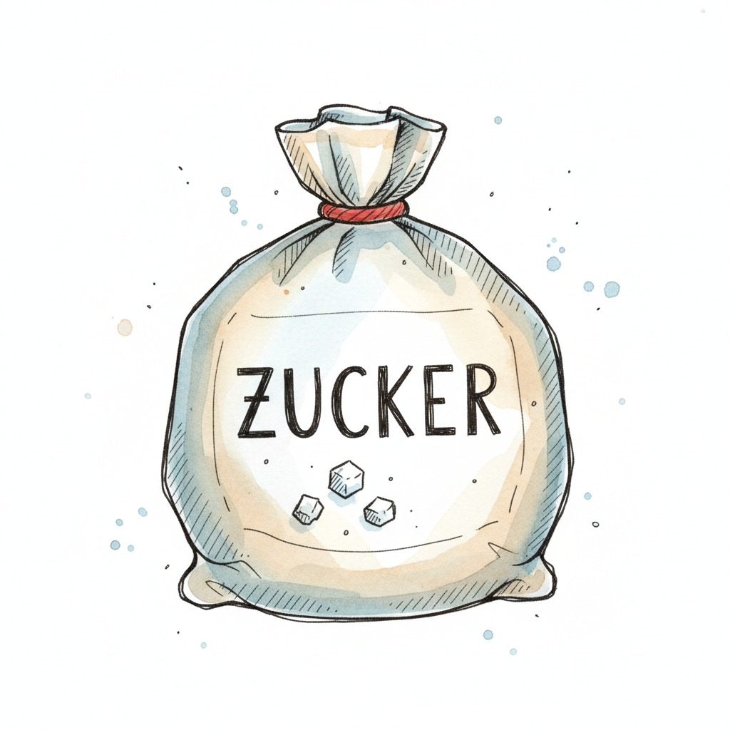 Aquarell-Illustration eines Beutels mit der Aufschrift 'ZUCKER' und Zuckerwürfeln.