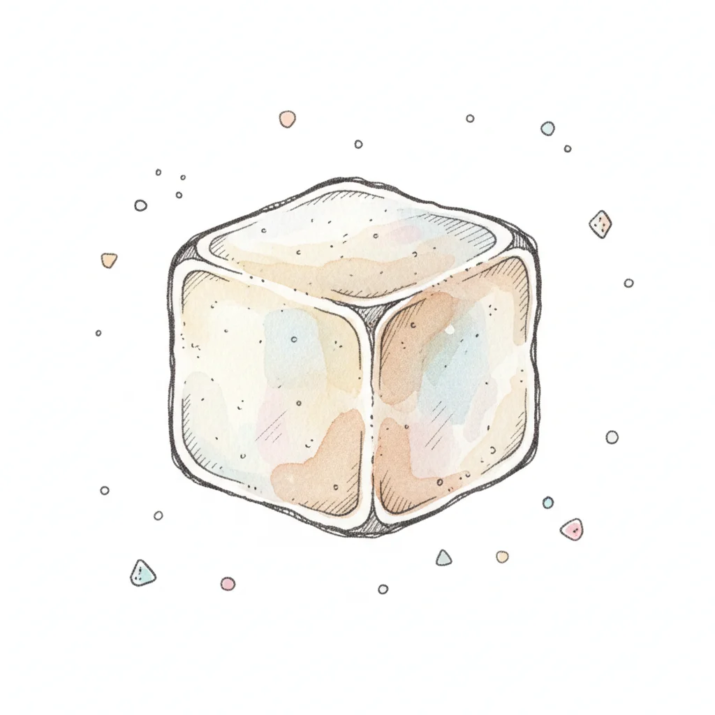 Aquarell-Illustration eines Zuckerwürfels mit sanften Farbtönen und kleinen Partikeln.