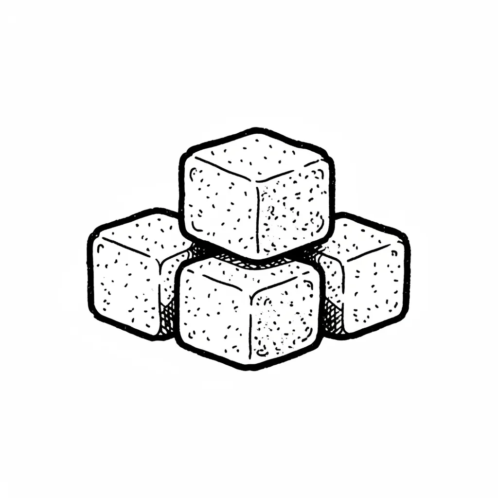 Cartoon-Zuckerwürfel in hellem Beige mit schwarzen Konturen und leichter Textur auf weißem Grund.