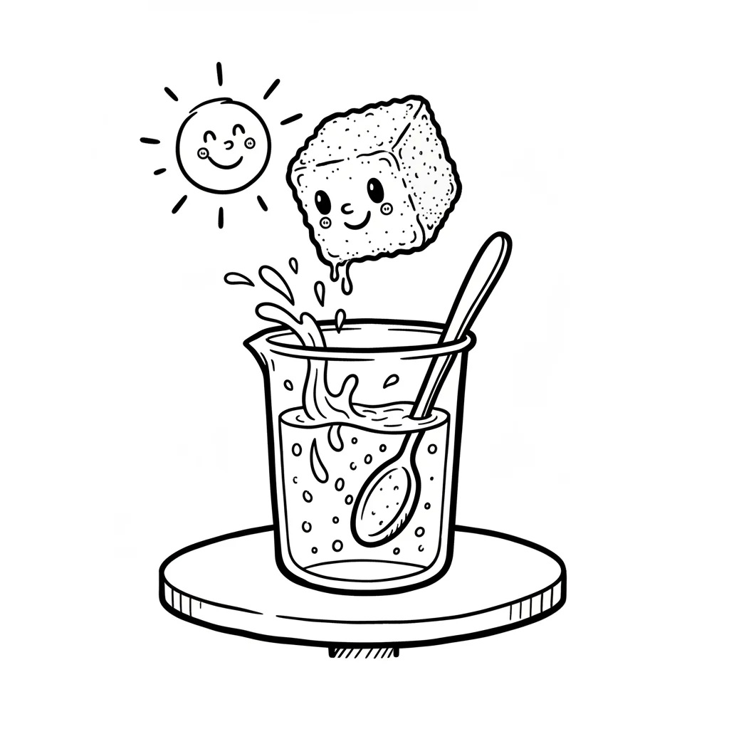 Schmelzender Zuckerwürfel fällt in Becherglas mit Flüssigkeit und Löffel, beobachtet von der Sonne.