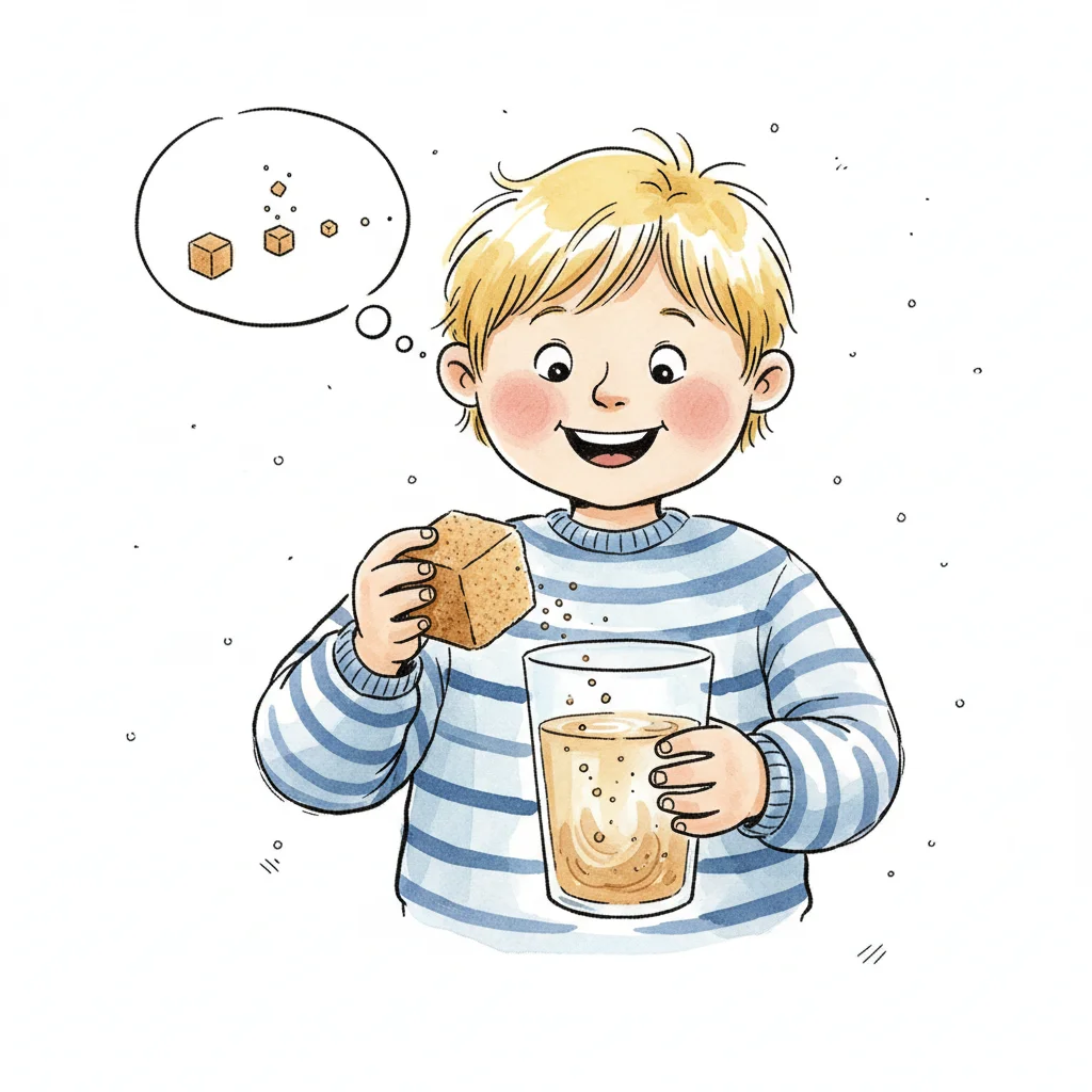 Ein lächelnder Junge hält einen Zuckerwürfel über ein Glas und denkt an kleinere Zuckerstücke.
