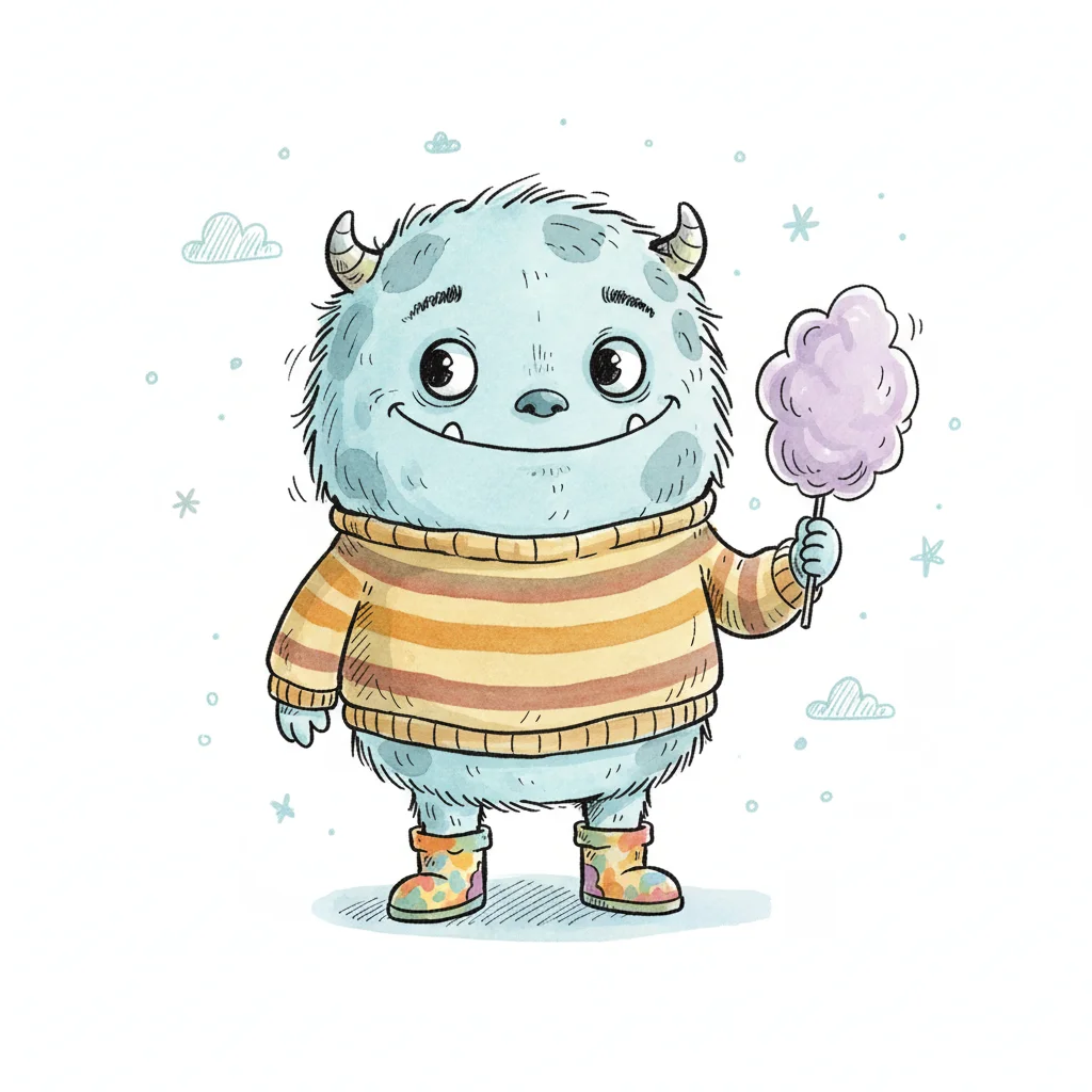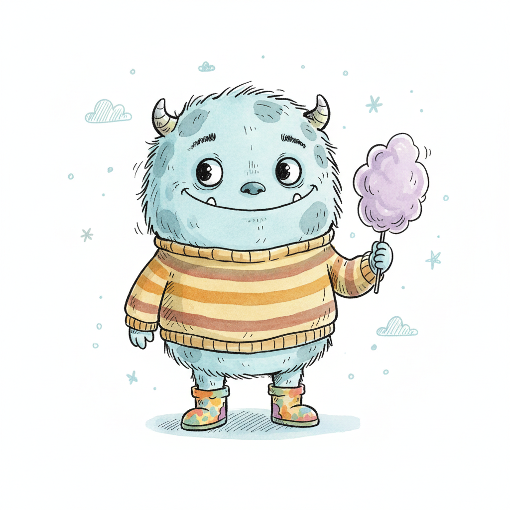 Ein süßes, blaues Monster in einem gestreiften Pullover hält Zuckerwatte und lächelt freundlich.