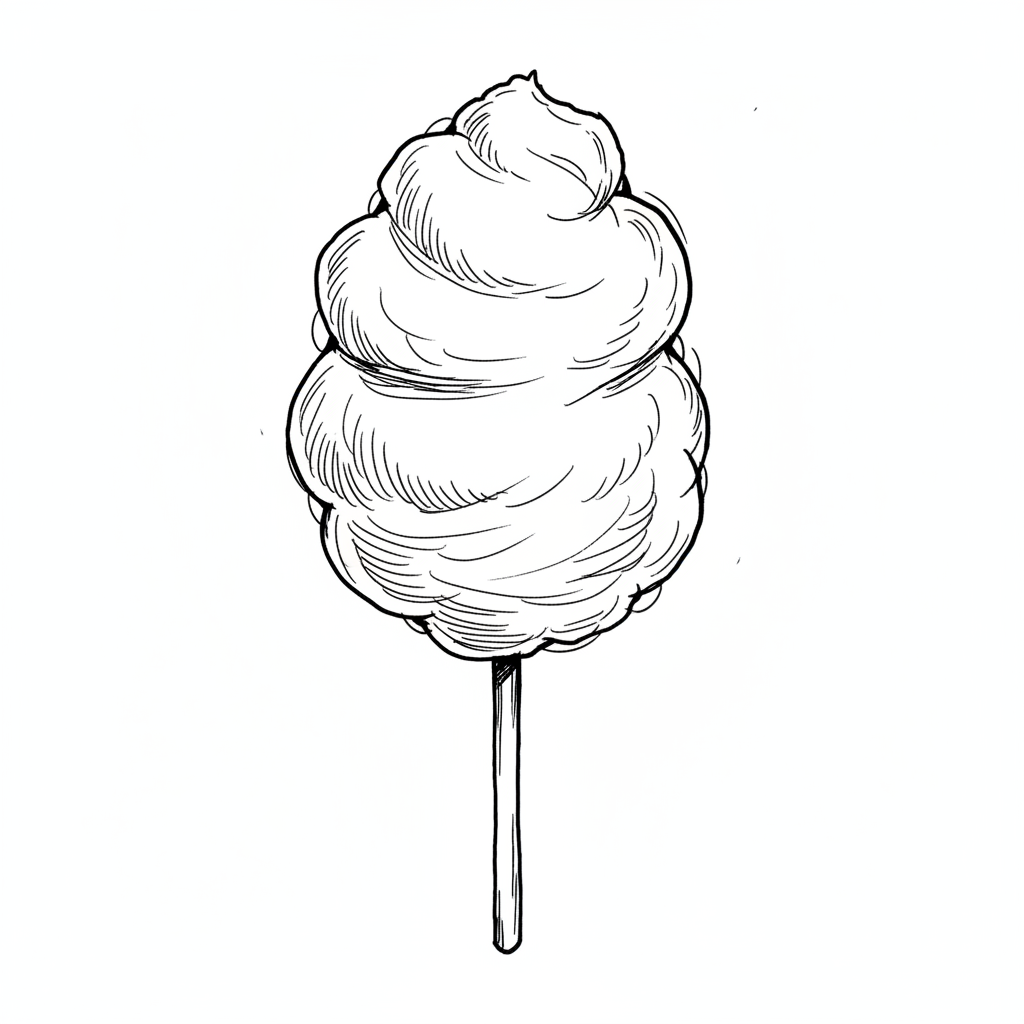 Schwarz-weiß-Zeichnung von Zuckerwatte auf einem Stiel.