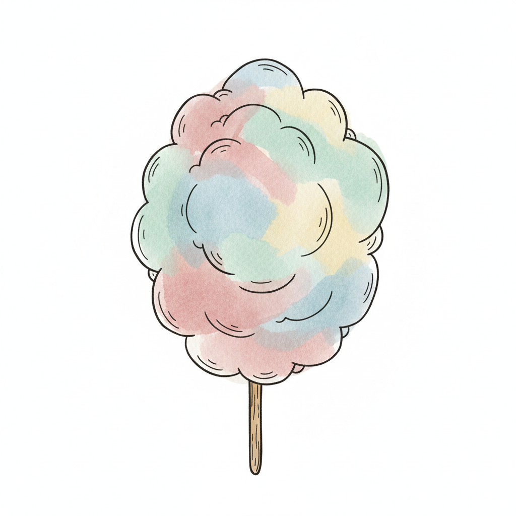 Bunte Zuckerwatte auf einem Stiel, gezeichnet im Aquarell-Stil mit Pastellfarben.