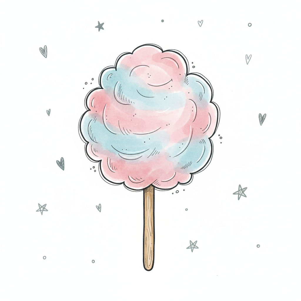 Niedliche Illustration von rosa-blauer Zuckerwatte auf einem Stiel, umgeben von Sternen und Herzen.