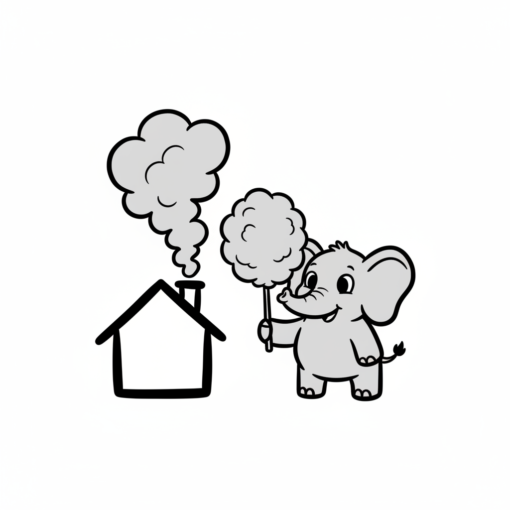 Niedlicher Elefant hält Zuckerwatte neben einem Haus, aus dessen Schornstein Rauch aufsteigt.
