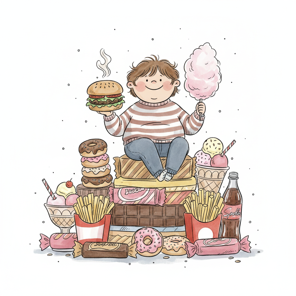 Fröhliches Kind sitzt auf einem Berg aus Süßigkeiten und Fast Food, hält Burger und Zuckerwatte.