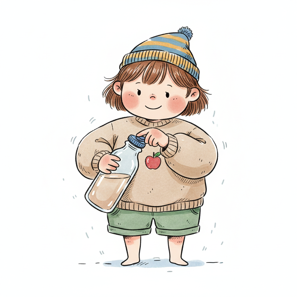 Niedliche, kindgerecht illustrierte Szene mit einem Kind oder einer Person als Hauptfigur, vor rein weißem Hintergrund, im frech-nordischen Aquarell-Skizzenstil. Klare, leicht wackelige Tuschekonturen, sichtbare Pinsel- und Strichtextur, dezente Schraffuren, weiche handgemalte Farbflächen in gedeckten Farben. Einfache, runde Formen. Keine harten Schatten, sondern sanfte, transparente Aquarellschichten. Leicht raue, handgezeichnete Linien statt glatter Vektorkanten. Subtile, vereinzelte Kritzelpunkte oder kleine Details im Hintergrund (wie Pünktchen oder feine Striche), aber keine echte Umgebung oder Landschaft. Die Figur ist mittig zentriert. Insgesamt charmant, humorvoll, warm und handgemacht wirkend. WICHTIG: Das Bild darf ABSOLUT KEINEN TEXT, KEINE BUCHSTABEN und KEINE ZAHLEN enthalten.