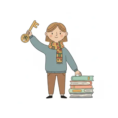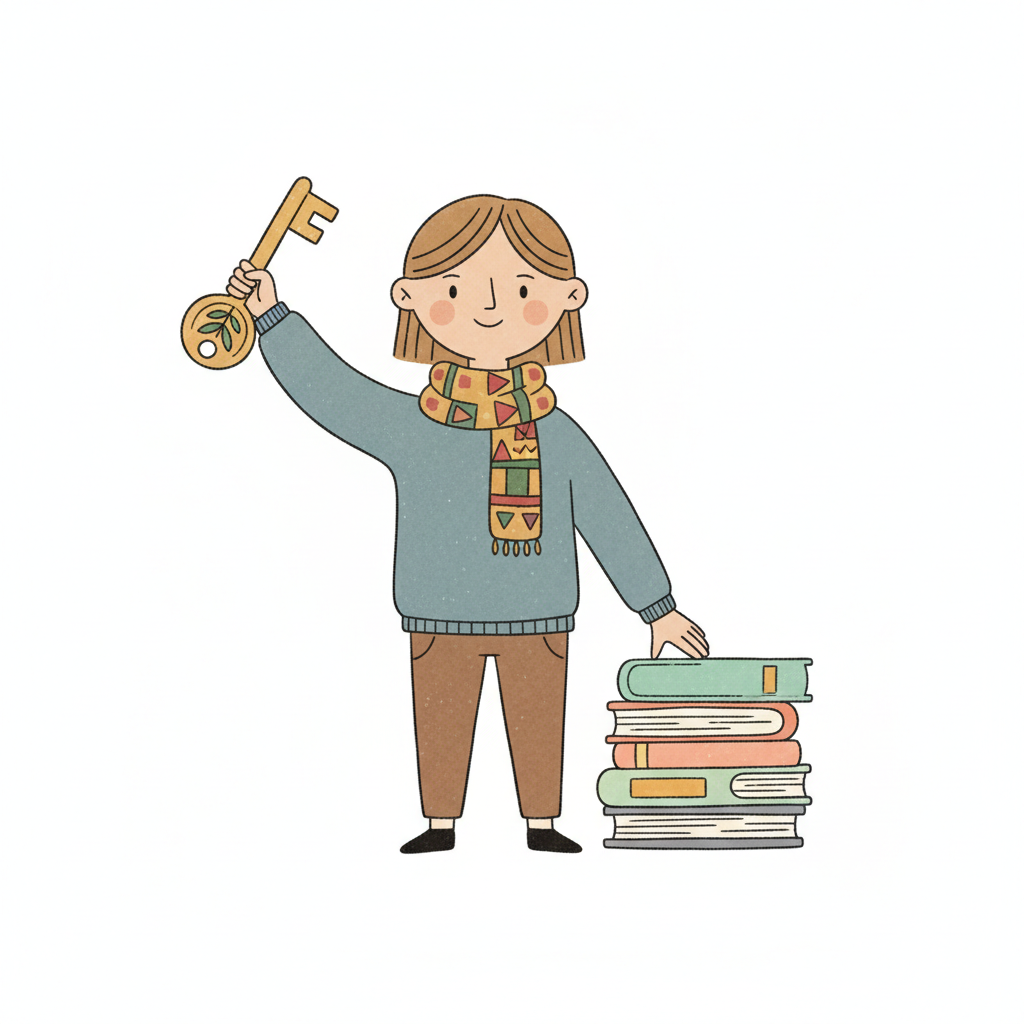 Fröhliche Figur mit großem Schlüssel und Bücherstapel, symbolisiert den Zugang zu Wissen.