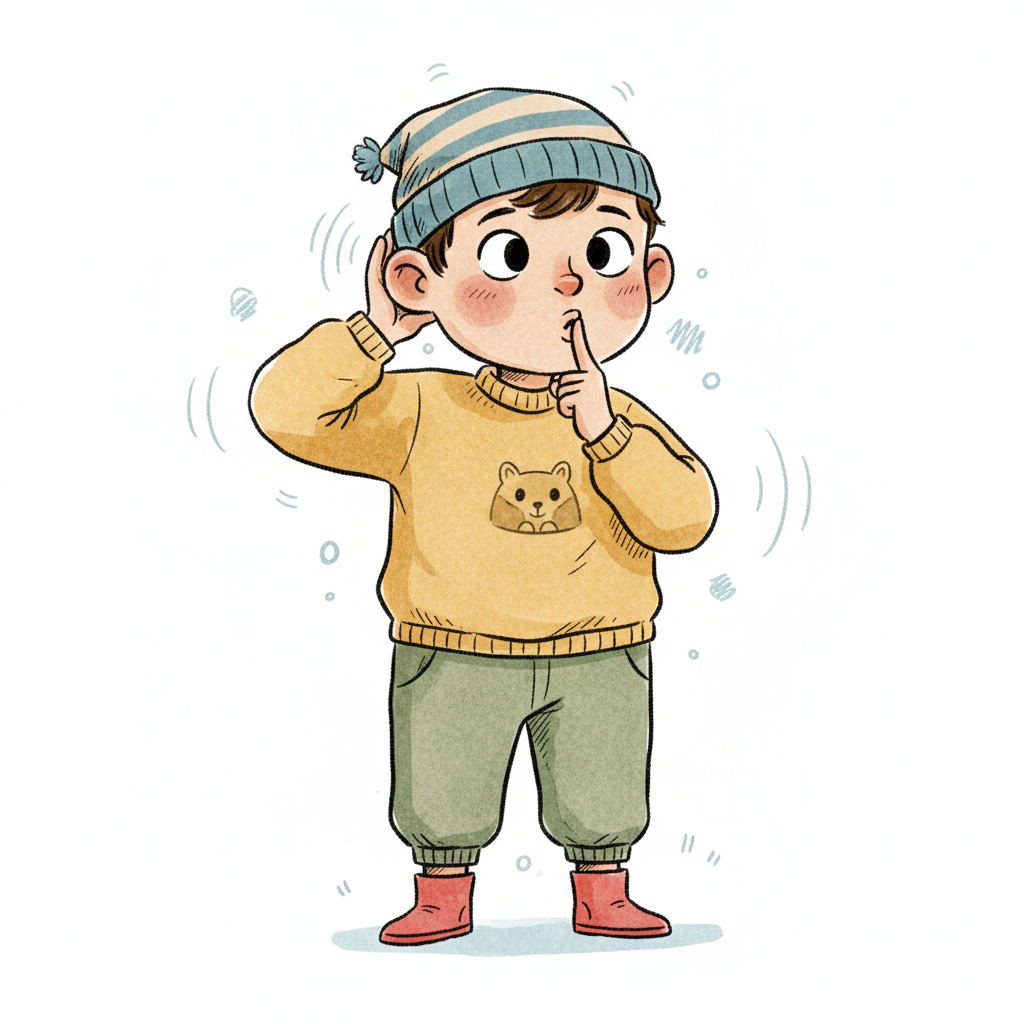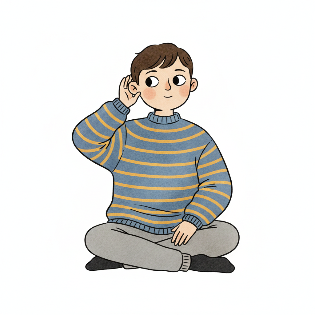 Handgezeichnete Kinderbuchillustration im modernen skandinavisch-nordischen Stil. Minimalistische, freundliche Figur mit einfachen Formen und leicht unregelmäßigen, handgezeichneten Linien. Ruhige, gedeckte Farbpalette, viel freie Fläche, reduzierte Details, sanfte Papier- oder Aquarellstruktur. Warme, ruhige, leicht humorvolle Stimmung, flächige Komposition ohne starke Perspektive, moderner nordischer Illustrationsstil, charmant und zeitlos.
