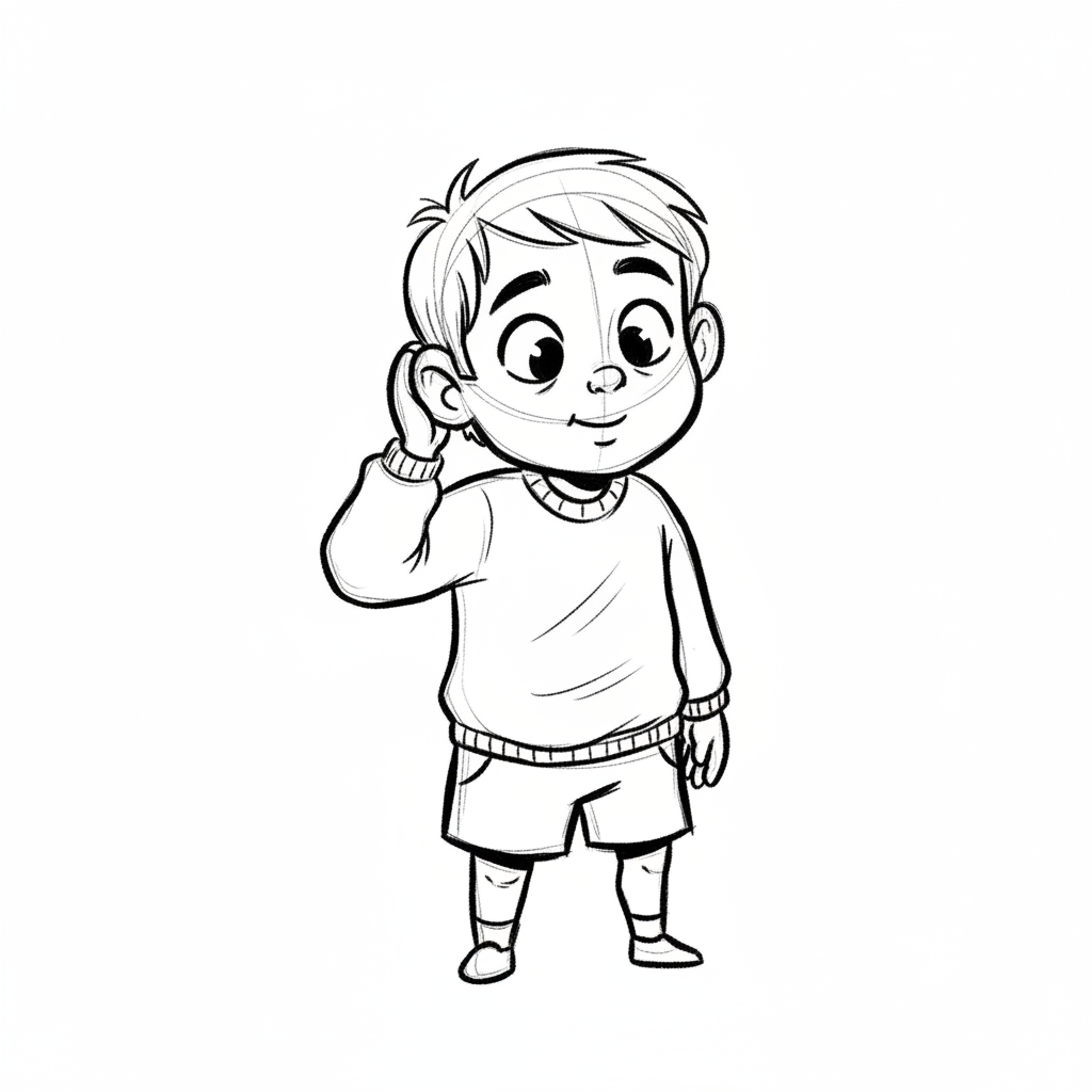 Niedliche, kindgerecht illustrierte Szene mit einem Kind oder einer Person als Hauptfigur, vor rein weißem Hintergrund, im frech-nordischen Aquarell-Skizzenstil. Klare, leicht wackelige Tuschekonturen, sichtbare Pinsel- und Strichtextur, dezente Schraffuren, weiche handgemalte Farbflächen in gedeckten Farben. Einfache, runde Formen. Keine harten Schatten, sondern sanfte, transparente Aquarellschichten. Leicht raue, handgezeichnete Linien statt glatter Vektorkanten. Subtile, vereinzelte Kritzelpunkte oder kleine Details im Hintergrund (wie Pünktchen oder feine Striche), aber keine echte Umgebung oder Landschaft. Die Figur ist mittig zentriert. Insgesamt charmant, humorvoll, warm und handgemacht wirkend. WICHTIG: Das Bild darf ABSOLUT KEINEN TEXT, KEINE BUCHSTABEN und KEINE ZAHLEN enthalten.