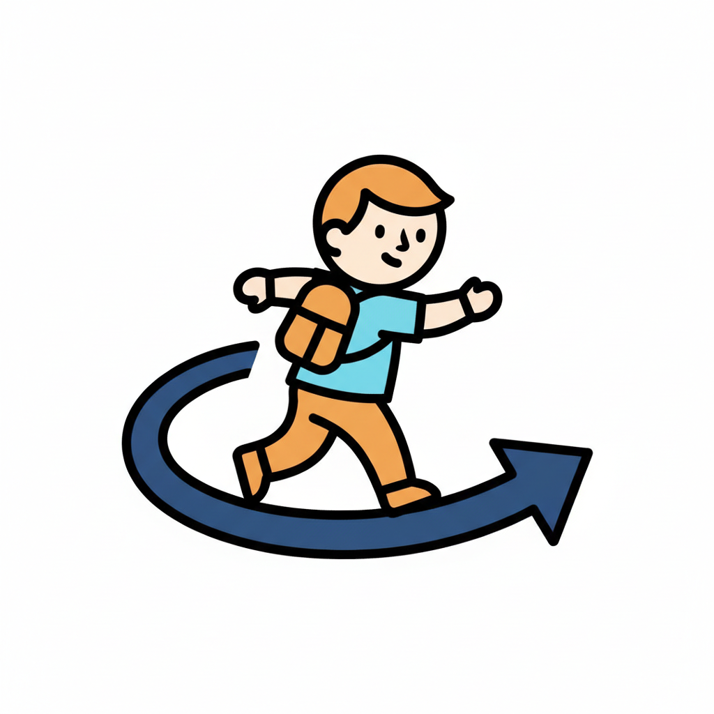 Ein lächelnder Cartoon-Junge mit blauem Rucksack rennt, ein Pfeil deutet auf Bewegung.