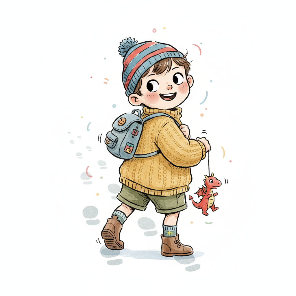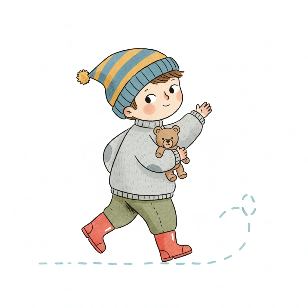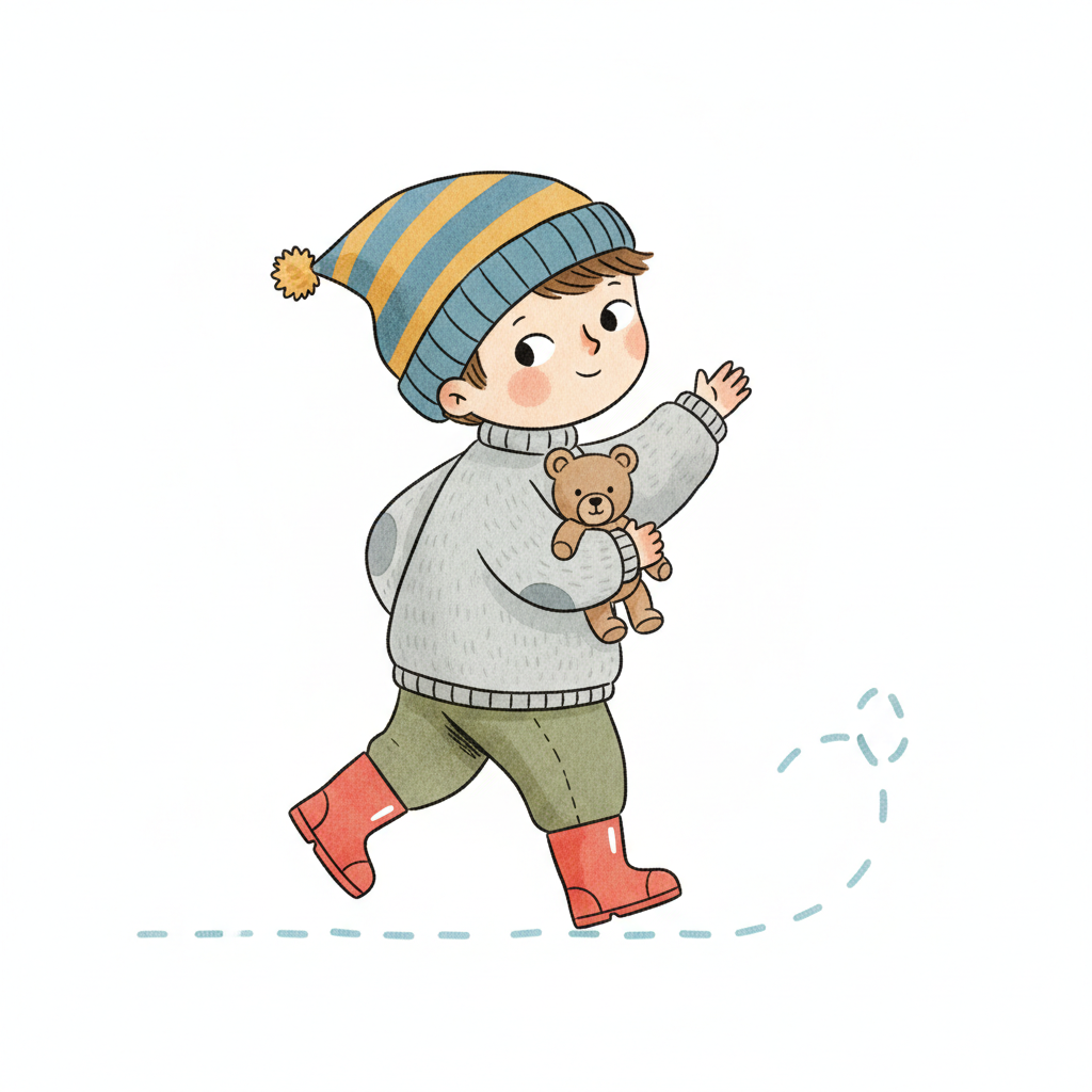 Fröhlicher Cartoon-Junge mit Mütze, Teddybär und roten Stiefeln winkt beim Gehen.