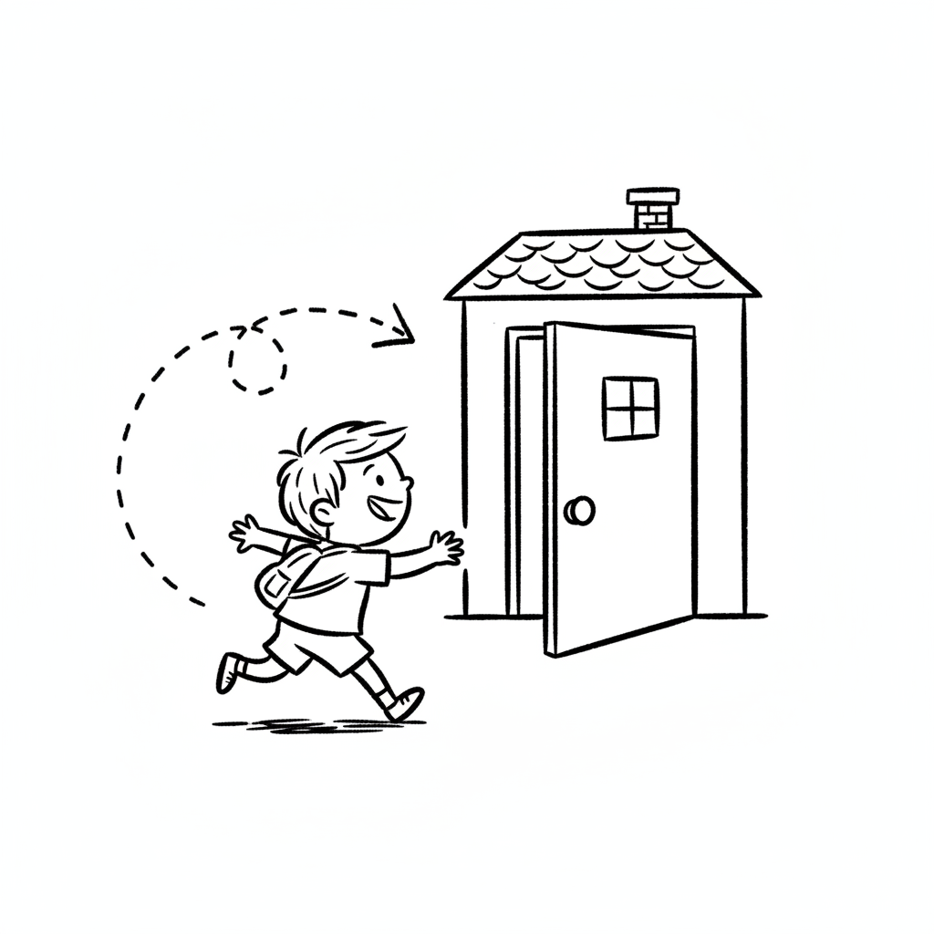 Ein fröhlicher Junge mit Rucksack rennt auf ein Haus mit offener Tür zu. Schwarz-Weiß-Zeichnung.
