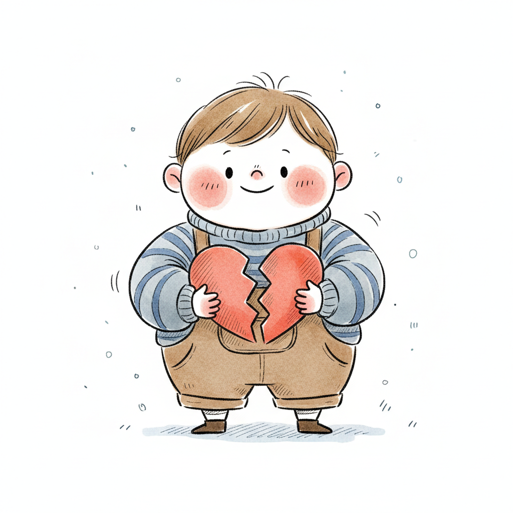 Niedlicher Cartoon-Junge mit roten Wangen hält ein zerbrochenes rotes Herz in den Händen.