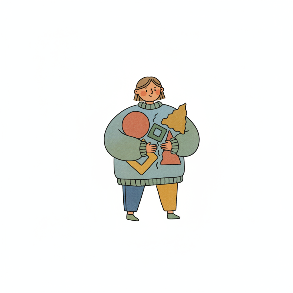Illustrierte Person in buntem Pullover, die geometrische Formen liebevoll umarmt.