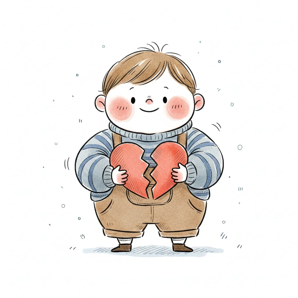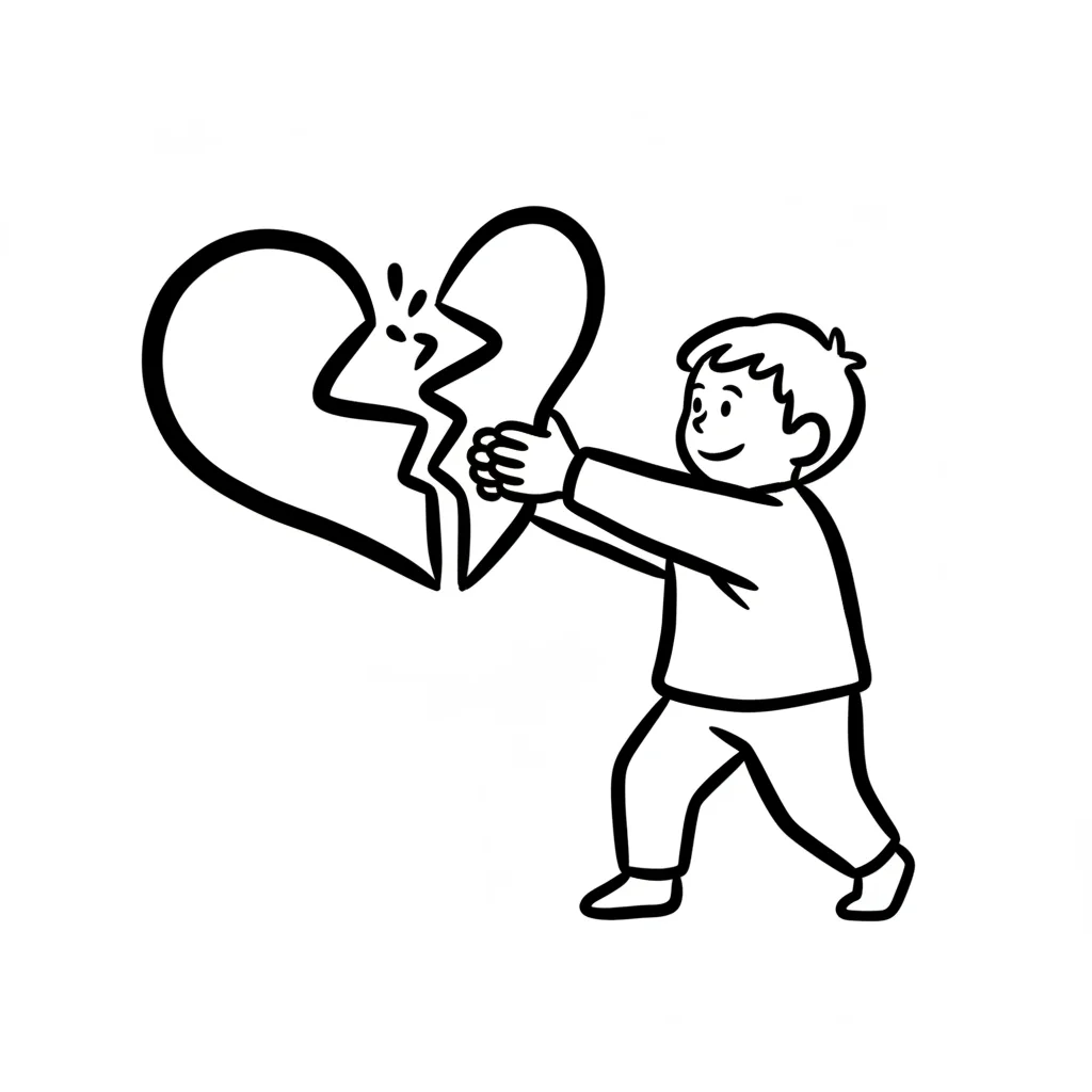 Ein lächelndes Kind hält ein zerbrochenes Herz und versucht, es wieder zusammenzusetzen.