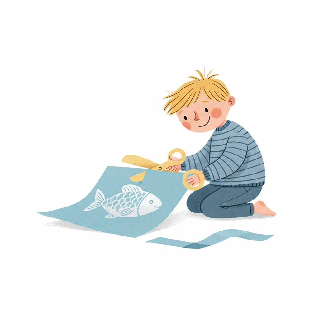 Ein lächelnder Junge kniet und schneidet mit einer Schere ein blaues Papier mit einem Fischmotiv aus.