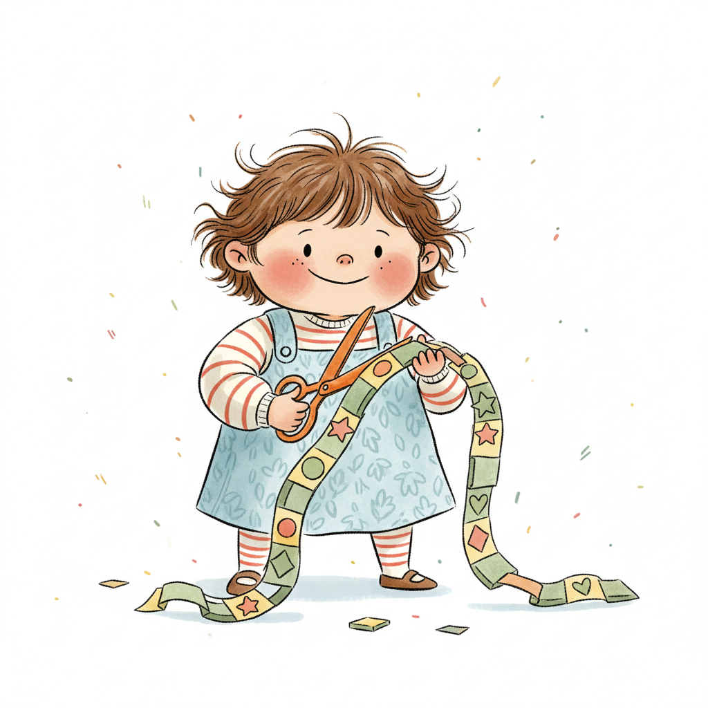 Ein lächelndes Kind schneidet eine lange, gemusterte Papierkette mit einer Schere.