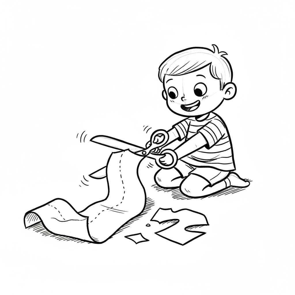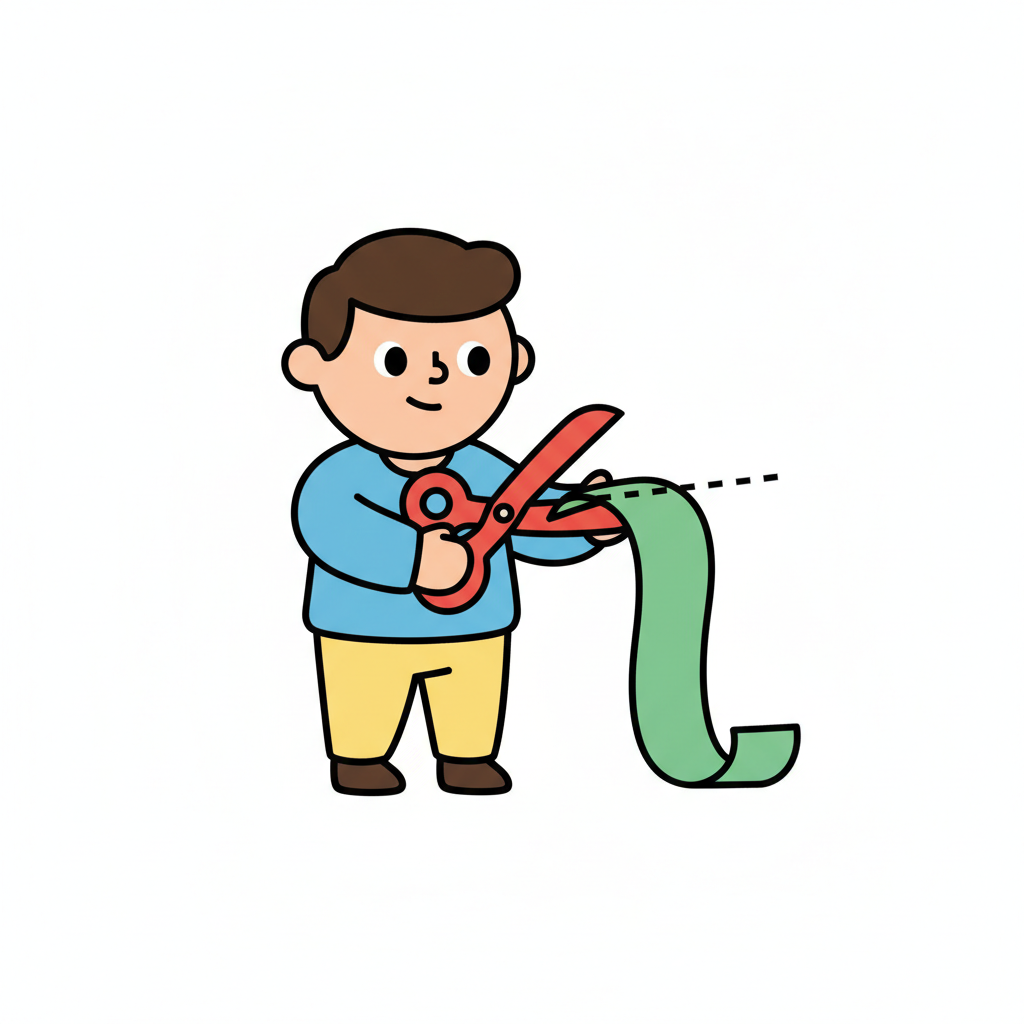Ein Cartoon-Junge schneidet einen grünen Streifen mit einer roten Schere.