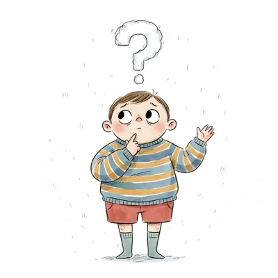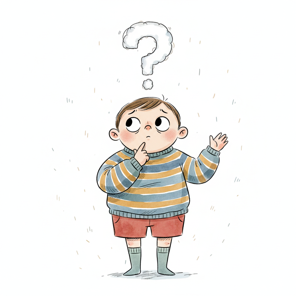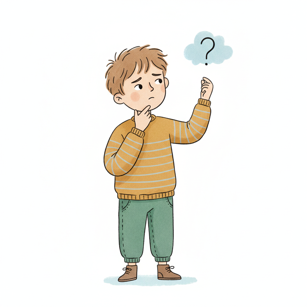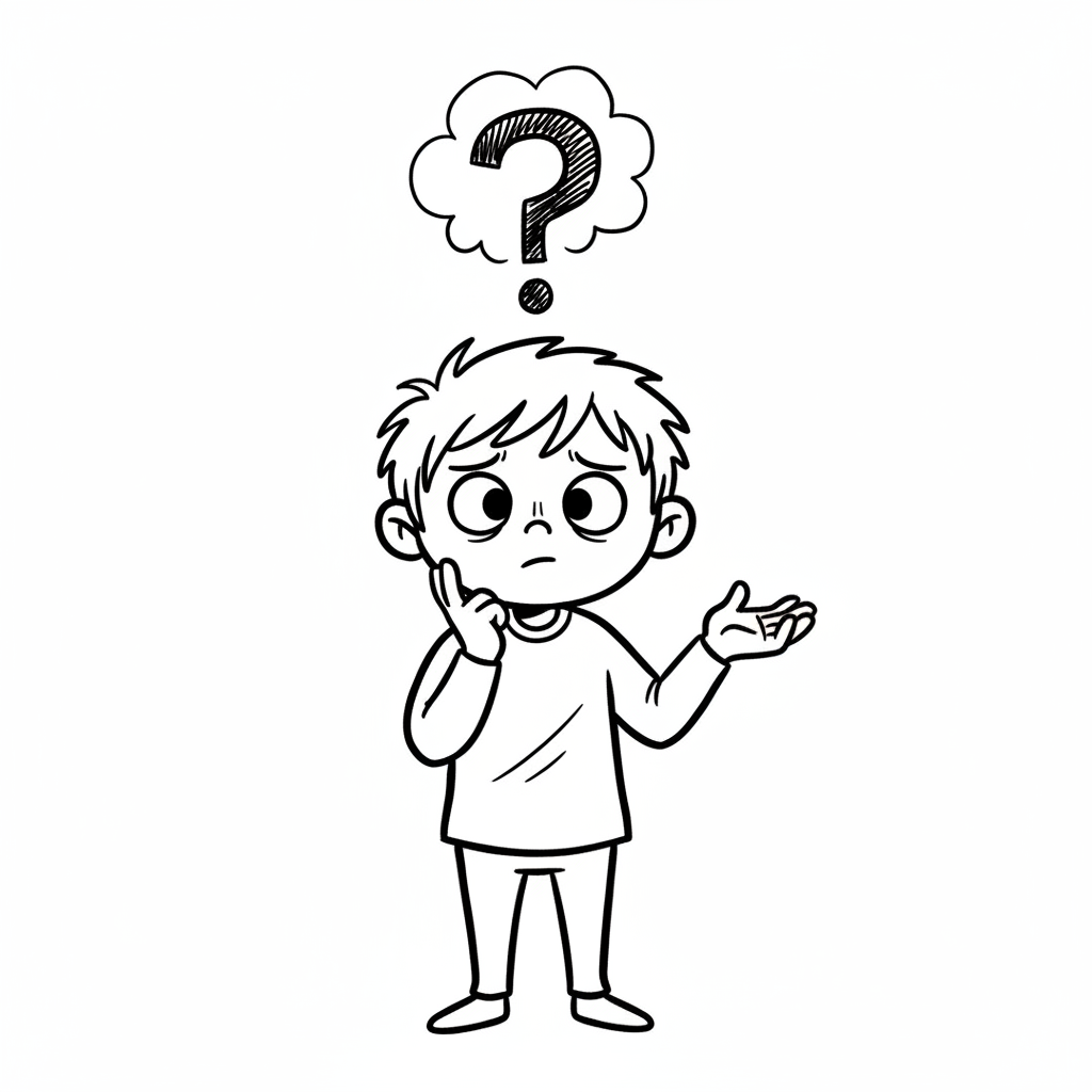 Ein Cartoon-Junge mit einem Fragezeichen über dem Kopf, der nachdenklich oder verwirrt aussieht.