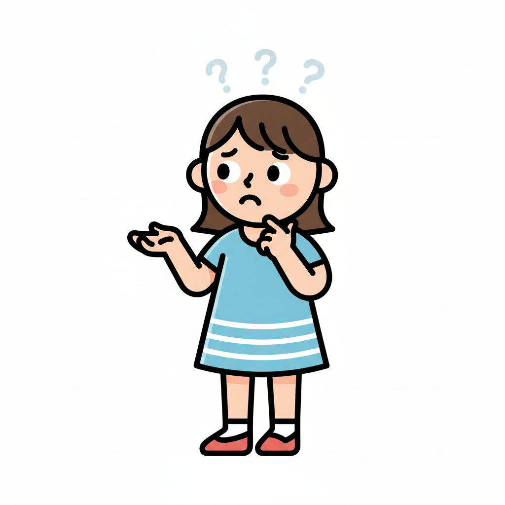 Cartoon-Mädchen mit fragendem Blick und Fragezeichen über dem Kopf, unsicher oder nachdenklich.