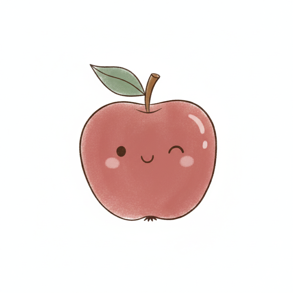 Niedlicher, rotbackiger Cartoon-Apfel mit witzigem Zwinkern und Blatt auf weißem Hintergrund.
