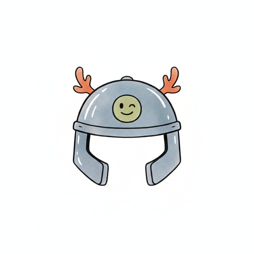 Niedlicher grauer Comic-Helm mit kleinen Geweihen und einem zwinkernden Smiley-Gesicht.
