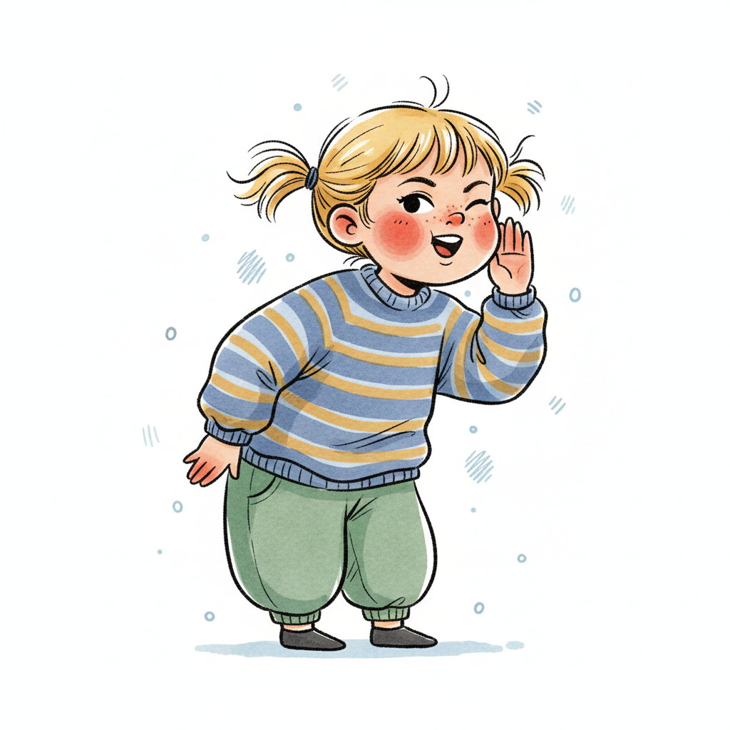 Niedliche, kindgerecht illustrierte Szene mit einem Kind oder einer Person als Hauptfigur, vor rein weißem Hintergrund, im frech-nordischen Aquarell-Skizzenstil. Klare, leicht wackelige Tuschekonturen, sichtbare Pinsel- und Strichtextur, dezente Schraffuren, weiche handgemalte Farbflächen in gedeckten Farben. Einfache, runde Formen. Keine harten Schatten, sondern sanfte, transparente Aquarellschichten. Leicht raue, handgezeichnete Linien statt glatter Vektorkanten. Subtile, vereinzelte Kritzelpunkte oder kleine Details im Hintergrund (wie Pünktchen oder feine Striche), aber keine echte Umgebung oder Landschaft. Die Figur ist mittig zentriert. Insgesamt charmant, humorvoll, warm und handgemacht wirkend. WICHTIG: Das Bild darf ABSOLUT KEINEN TEXT, KEINE BUCHSTABEN und KEINE ZAHLEN enthalten.